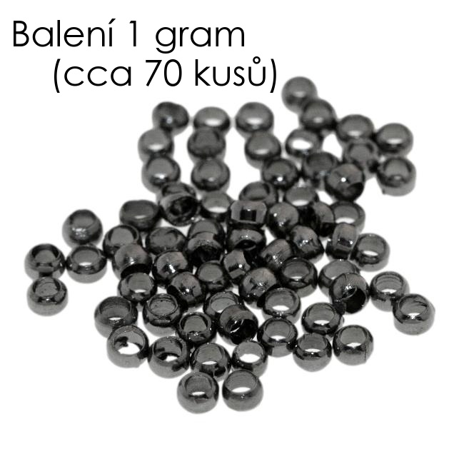 Zamačkávací, drobné, kovové korálky v barvě antracitu.