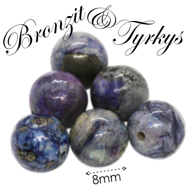 Korálky tvoří, člověkem vytvořená směs ze syntetického TYRKYSU s přírodním BRONZITEM.
