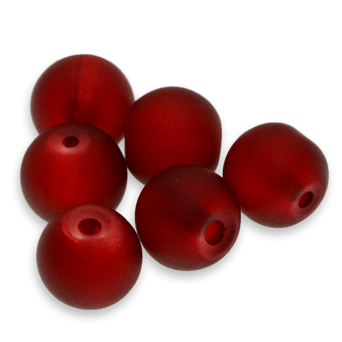 Červené, skleněné kuličky s matným povrchem.
