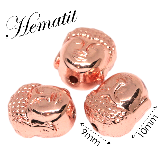 Korálky ve tvaru Buddhy ze syntetického HEMATITU s pokovem v barvě růžového zlata, uzemňujícího, ochranného kamene, který pomáhá nastolit rovnováhu těla, mysle a ducha. Odstraňuje a zabraňuje negativní energii a rušivým vlivům vstoupit do aury a proto navozuje jeho nositeli klid, mír a harmonii.