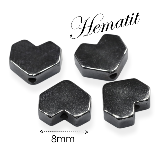 Korálky ve tvaru srdíčka v šedé barvě, ze syntetického HEMATITU, uzemňujícího, ochranného kamene, který pomáhá nastolit rovnováhu těla, mysle a ducha. Odstraňuje a zabraňuje negativní energii a rušivým vlivům vstoupit do aury a proto navozuje jeho nositeli klid, mír a harmonii.