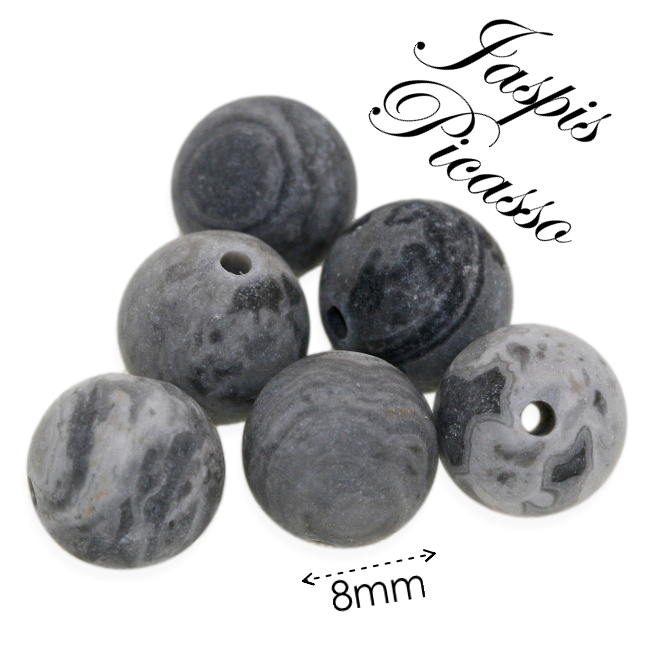 Kuličky matného, přírodního Picassova JASPISU, kamene, který uzemňuje energii těla, pohlcuje negativní energii, pročišťuje a uvádí do rovnováhy auru. Navozuje rovnováhu duševní, citovou i tělesnou a uvádí nás do klidu. Zlepšuje obecnou vitalitu a nastavuje pocit štěstí.