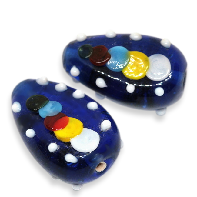 Modrá, vesele vyzařující, vinutá perla s výstupky a barevnými puntíky.