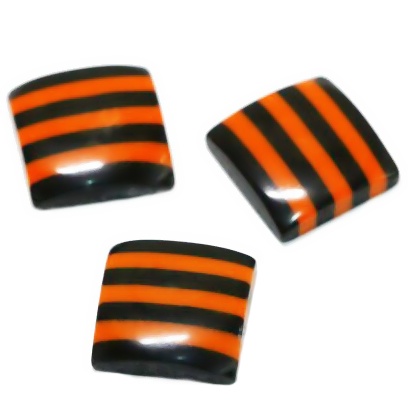 Akrylový, pruhovaný, oranžovo-černý kabošon. Na povrchu se mohou objevit drobné vady - škrábanečky,