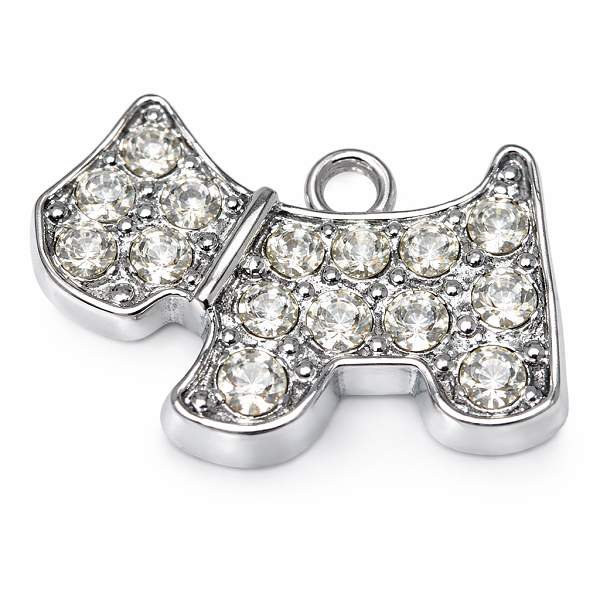 Kovový pejsek s třpytivými kamínky v barvě platiny. Jednostranný, ze zadní strany hladký.