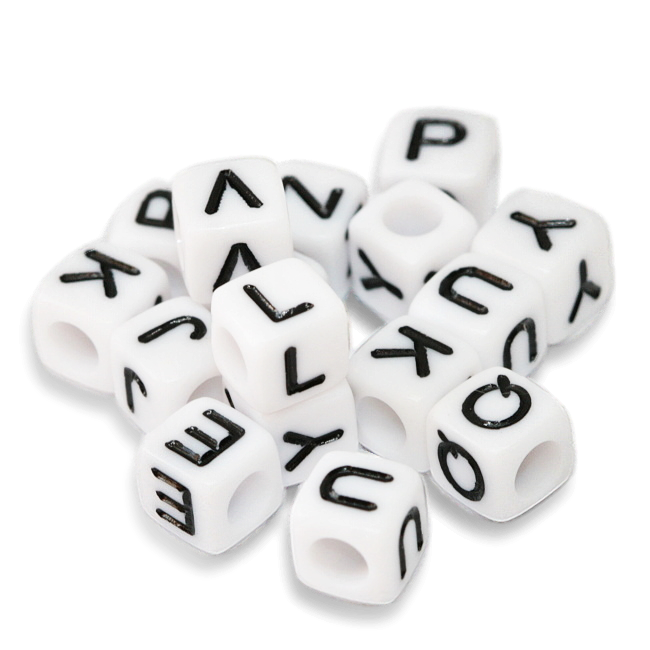 Plastové, bílé korálky ve tvaru kostky s s černým písmenem.