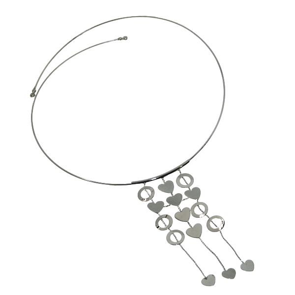 Kovový náhrdelník v platinové barvě se srdíčky a kolečky na obruči.