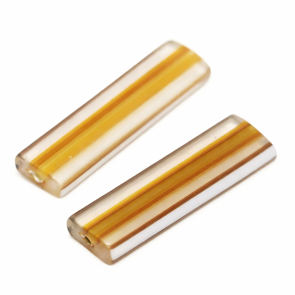 Skleněný obdelník, pruhledný s béžovým středem a bílými linkami na okraji. Korálky jsou sekané, nemají zcela rovné okraje a velikostně se liší. Je nutné brát zřetel na jejich variabilitu.