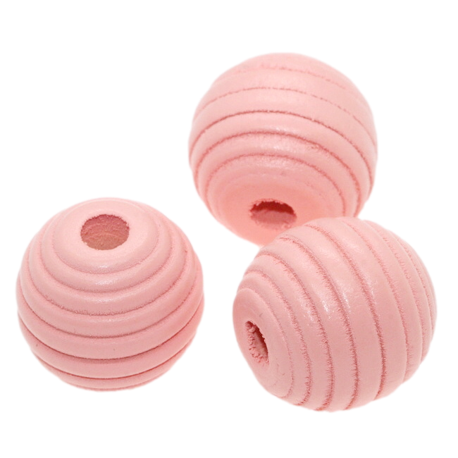 Dřevěné, růžově barvené, kulaté korálky se vzorem úlu.