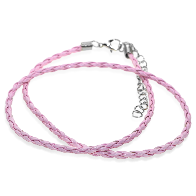 Kompletní, pletená šňůrka v růžové barvě. Jedná se o imitaci kůže. Šňůrka je zakončená z jedné strany karabinkou, z druhé zakončovacím řetízkem. Kovové, železné komponenty jsou v platinové barvě.