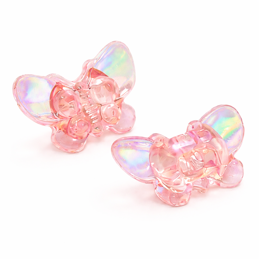 Plastový, transparentní motýlek v růžové barvě. Povrch je duhový (na fotce není dobře vidět na světlém podkladě). Ze zadní strany dírka. Myslím, že by se motýlci hodili i jako knoflíčky nebo třeba na gumičky do vlasů :-).