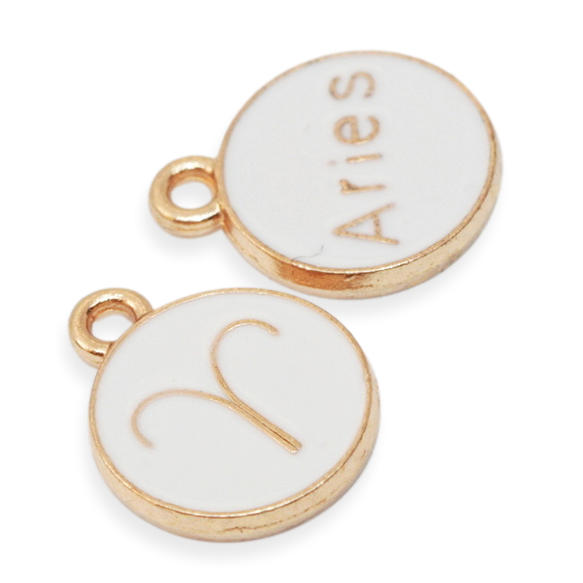 Kovový medailonek v barvě světlého zlata s bílým smaltováním a znamením zvěrokruhu - BERAN. Z jedné strany je znak a z druhé anglický nápis Aries.