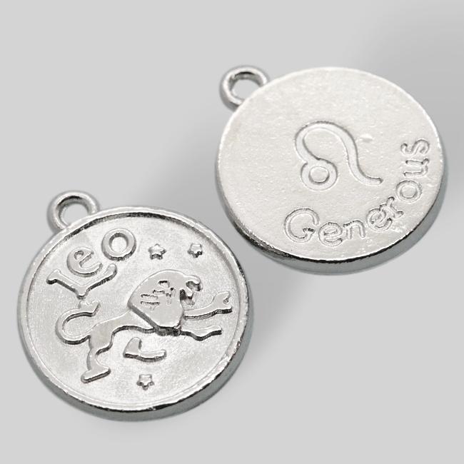 Kovový medailonek v barvě stříbra se znamením zvěrokruhu - LEV. Ze zadní strany je znak a nápis vlastnosti znamení.