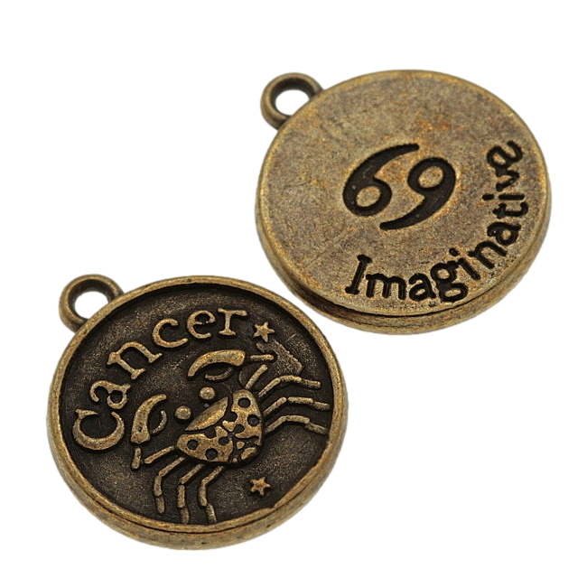 Kovový medailonek v barvě starobronzi se znamením zvěrokruhu - RAK. Ze zadní strany je znak a nápis vlastnosti znamení.