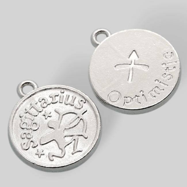 Kovový medailonek v barvě stříbra se znamením zvěrokruhu - STŘELEC. Ze zadní strany je znak a nápis vlastnosti znamení.