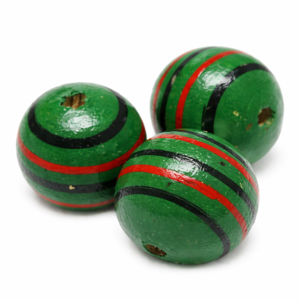 Zelená, dřevěná kulička s proužky. Kuličky nejsou vždy zcela pravidelné.