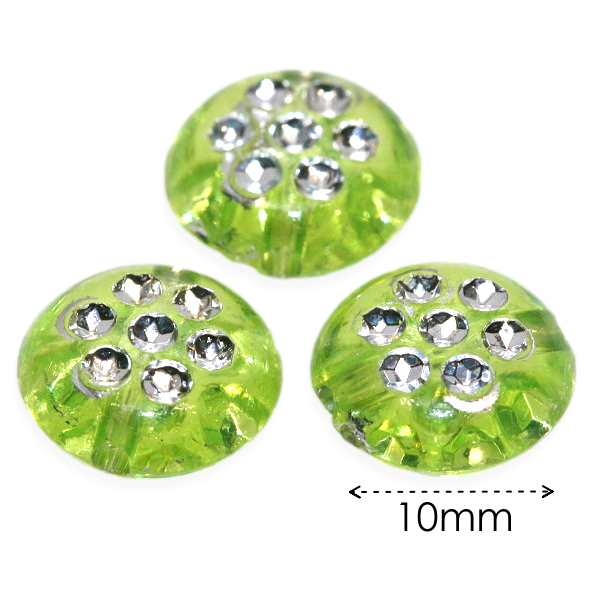 Plastové, zelené, průhledné kolečko se stříbrným, pokoveným květem. Květ je z obou stran korálky. Stříbrné pokovení občas přečuhuje mimo květy.