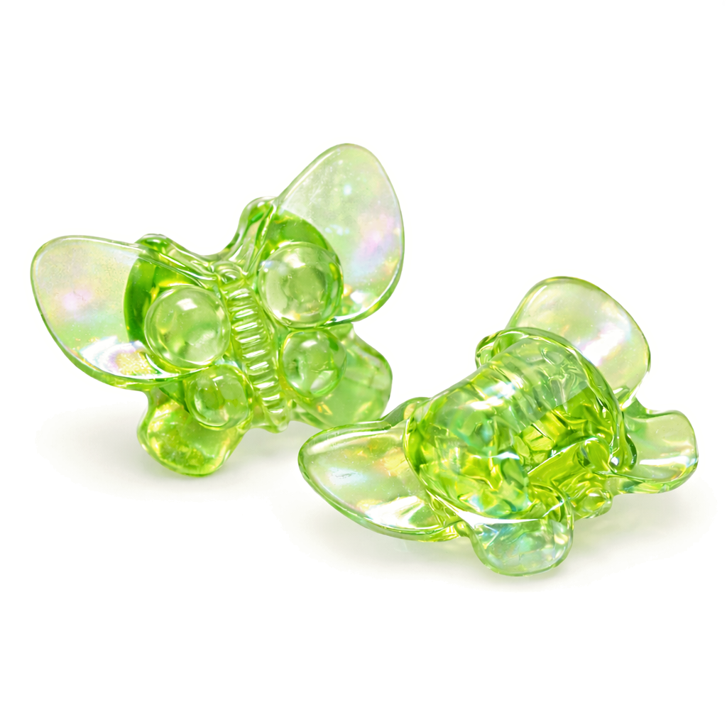 Plastový, transparentní motýlek v zelené barvě. Povrch je duhový (na fotce není dobře vidět na světlém podkladě). Ze zadní strany dírka. Myslím, že by se motýlci hodili i jako knoflíčky nebo třeba na gumičky do vlasů :-).