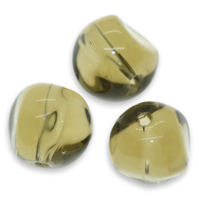 Žluto-šedé, ze tří stran zploštělé, skleněné, průhledné kuličky.