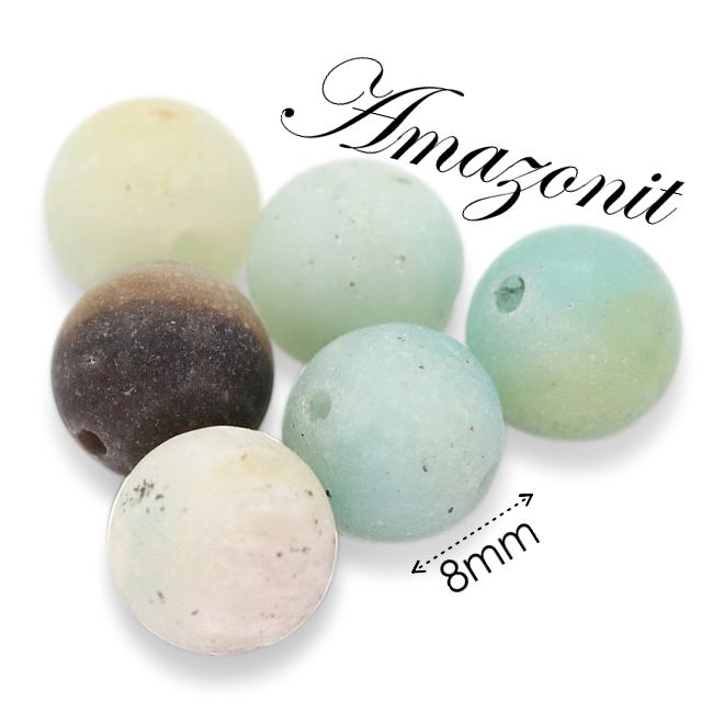 Korálky z přírodního matného AMAZONITU, kamene, který se vyznačuje účinky pro klid a rovnováhu duše, pocit bezpečí a harmonie. Zároveň udržuje v rovnováze mužskou a ženskou energii, hojí citová traumata a odstraňuje negativní energii. Rozvíjí intuici a pomáhá v rozhodování.