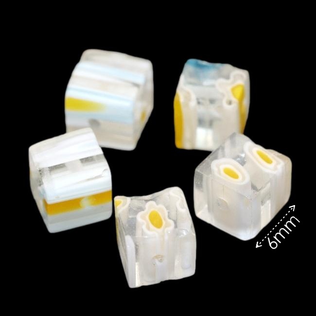 Skleněná kostka millefiori s květy. Každá kostka je trošku jiná, nejsou úplně pravidelné.