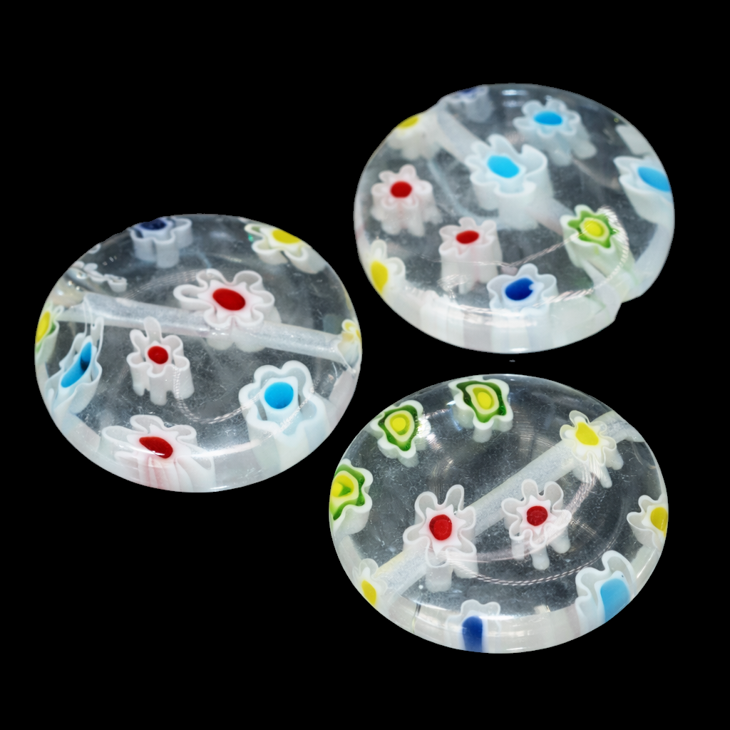 Skleněný millefiori korálek čirý s bohatým květinovým vzorem. Vzor vzniká tradiční technikou millefiori – vrstvením barevných skleněných prutů, které po rozřezu vytváří charakteristické „květiny“.