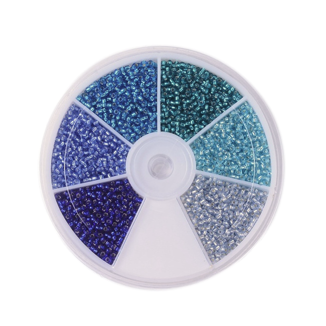 Modrý, čínský rokajl se stříbrným průtahem třídy A - je kvalitnější než běžný čínský rokajl ;-). Set 6 barev v praktickém rozřadníku.
