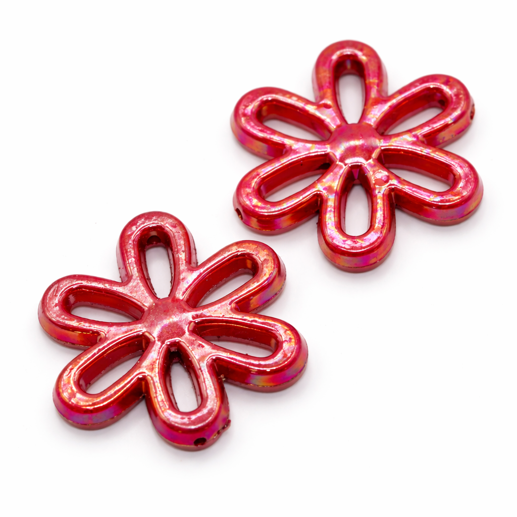 Plastový korálek ve tvaru květu v červené barvě s AB efektem, který na světle vytváří duhové odlesky. Lesklý povrch dodává korálku výrazný a hravý vzhled.