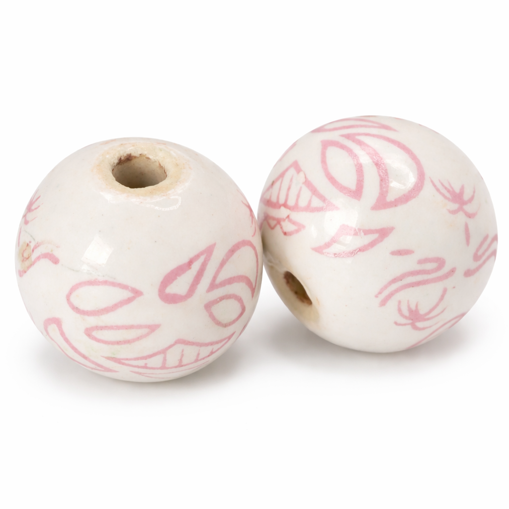 Porcelánový korálek kulatého tvaru v bílé barvě s jemným růžovým dekorem. Vzor působí lehce kresleně a dodává korálku hravý, osobitý charakter.