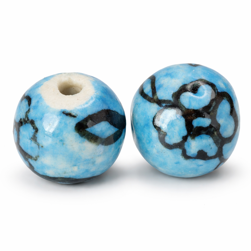 Porcelánový korálek kulatého tvaru v modrém odstínu s jemně lesklou glazurou a kontrastním tmavým dekorem. Vzor působí lehce abstraktně až květinově a dodává korálku zajímavý, originální vzhled.