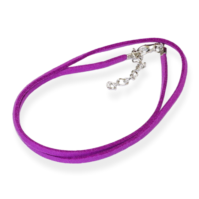 Semišová šňůrka v barvě růžovo-fialové. Jedná se o imitaci kůže. Šňůrka je zakončená z jedné strany karabinkou, z druhé zakončovacím řetízkem. Kovové, železné komponenty jsou v platinové barvě.