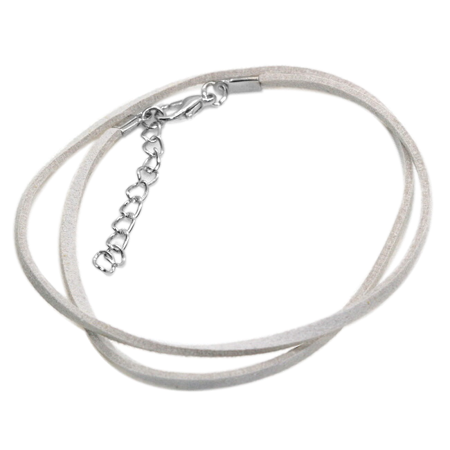 Semišová šňůrka v barvě šedé. Jedná se o imitaci kůže. Šňůrka je zakončená z jedné strany karabinkou, z druhé zakončovacím řetízkem. Kovové komponenty jsou v platinové barvě.