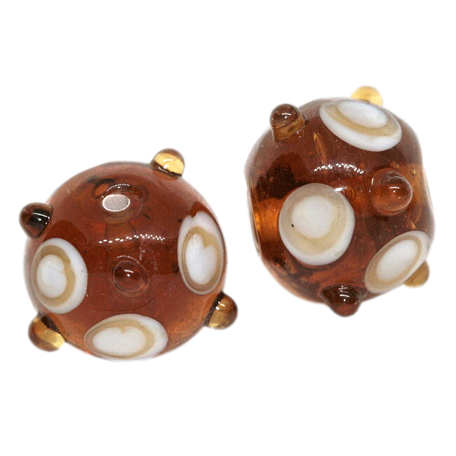 Skleněná, vinutá, žlutá kulička s výstupky.